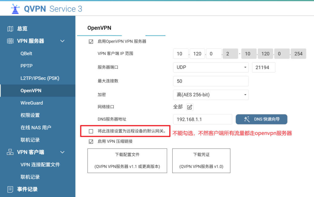 2、威联通OpenVPN默认为Full Tunneling(全隧道),实现了所有流量(包括互联网)都强制通过 VPN 隧道路由到 NAS。这提供更高的安全性(所有流量加密),但会让 NAS 成为所有客户端的“流量中转站”,多人连接时容易造成带宽瓶颈和拥堵。
